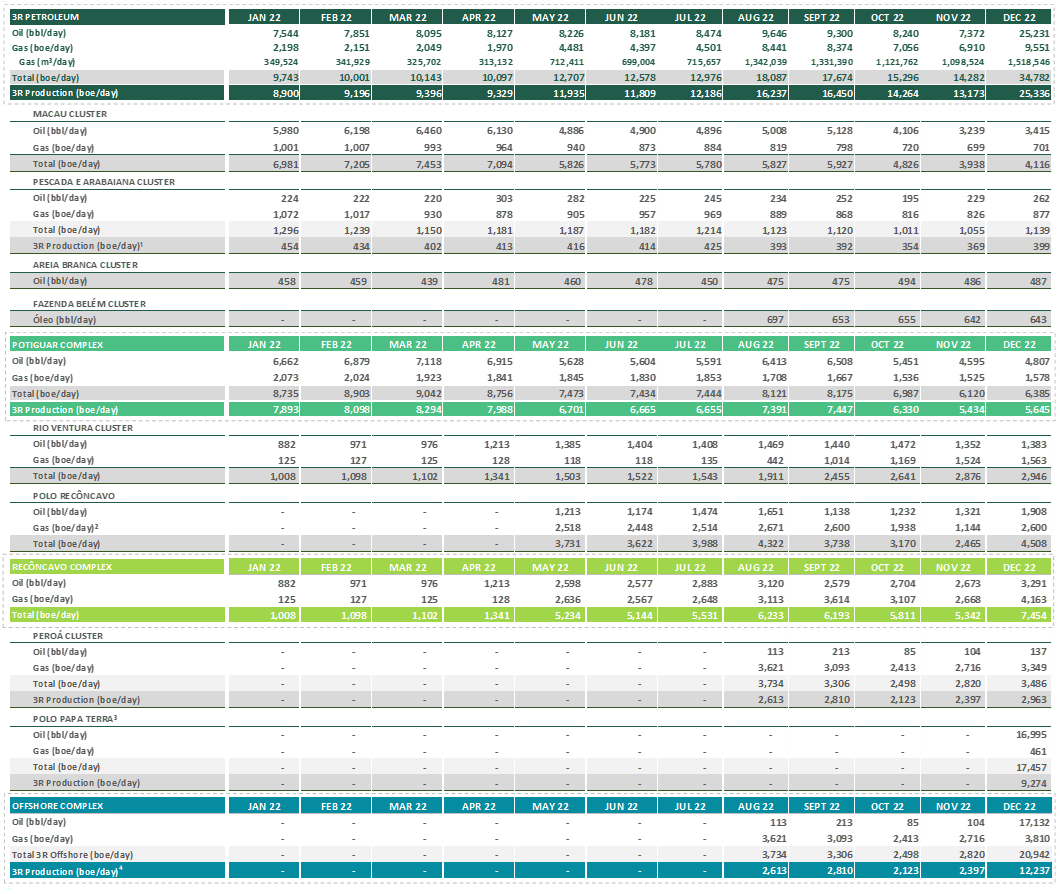 The Company is the operator of Macau, Areia Branca, Fazenda Belém, Rio Ventura, Recôncavo, Peroá and Papa Terra Clusters and holds a 35% stake in Pescada Cluster, the latter operated by Petrobras. The consolidated average daily production of the eight clusters mentioned above totaled 34,782 barrels of oil equivalent (boe) in December 2022. Of this total, the portion referring to 3R’s stake reached an average daily production of 25,336 boe.