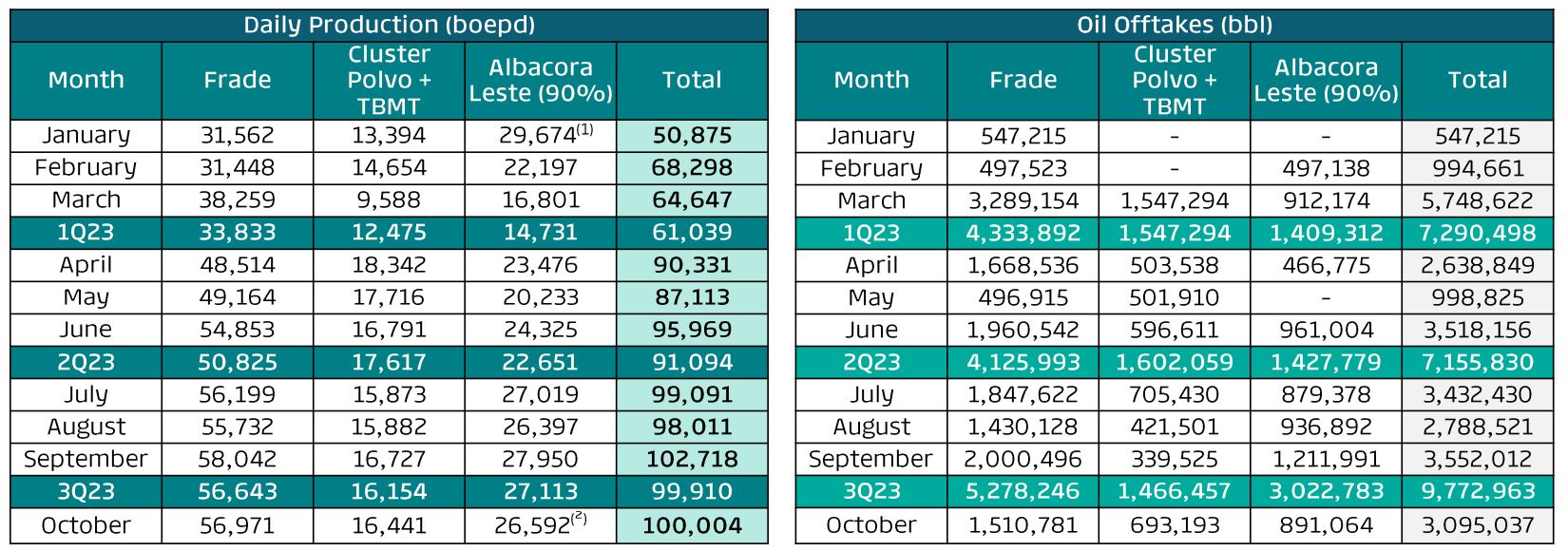 (1) The figures refer to PRIO’s 90% interest in Albacora Leste, assuming production throughout the month. As the acquisition’s closing happened on January 26, 2023, the field contributed proportionally with 5,919 barrels per day during the month of January. (2) The production in Albacora Leste Field was impacted by occasional stoppages for preventive and corrective maintenance on the fire-fighting and power generation systems. All repairs have now been carried out and the field’s current average production is 31 kbpd (net PRIO).