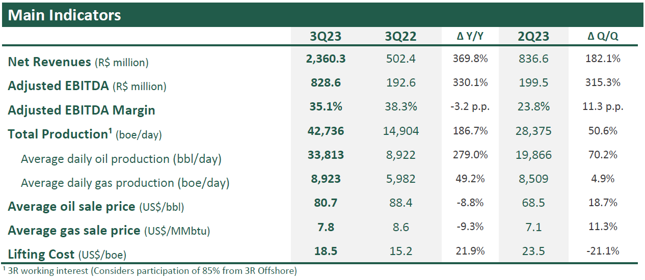 - 3Q23 proves the benchmark position of 3R in Brazilian onshore basins, as it has positioned itself as the only truly independent company and one which has achieved major integration into the production chain, resulting in commercial and operational flexibility