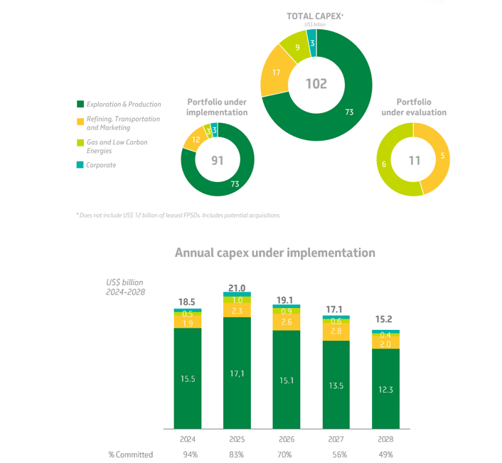 The CAPEX forecast for the 2024-2028 period totals US$102 billion, 31% higher than the previous plan, with US$91 billion corresponding to projects under implementation (Portfolio under Implementation) and US$11 billion composed of projects under assessment (Portfolio under Evaluation), which are subject to additional financial feasibility studies before contracting and execution begin. When studies are completed and their economic viability is proven, these projects can migrate to the Portfolio under Implementation. The financial feasibility study for projects under evaluation is an additional item to the governance established for approving projects, which is maintained for both portfolios. This way of presenting the portfolio demonstrates a commitment to transparency and a further advance in the governance of project approval.