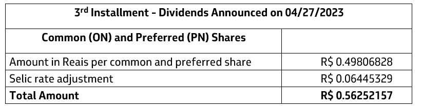 The dividends not claimed within three years, as of the date of payment (12/27/2023), will expire and will be reverted in favor of the company (Law 6404/76, Article 287, Item II, subitem a).