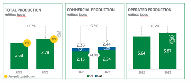 As a highlight of 2023, the company achieved an annual record of total own production of oil and natural gas in the pre-salt, with 2.17 MMboed, surpassing the previous record of 1.97 MM boed in 2022 and representing 78% of our total production.