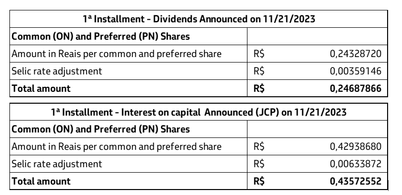For shareholders with custody in B3, the payment will be done by deposit brokers. For holders of American Depositary Receipts (ADRs) negotiated on the New York Stock Exchange (NYSE), the payment will be made from 02/27/2024 by JP Morgan Chase, depositary bank of ADRs. Information and clarifications may be obtained at www.adr.com
