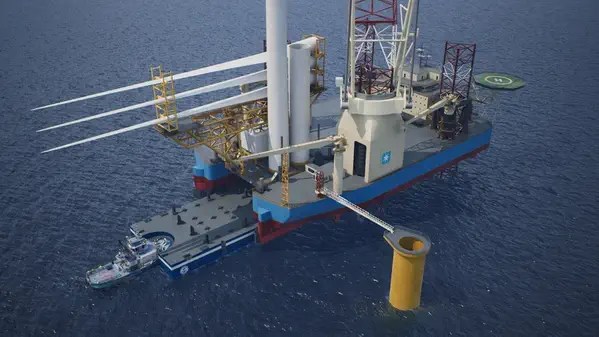 Using the U.S. built, owned and flagged tugs and barges to ferry turbine components, Maersk Supply Service’s locking and stabilizing mechanism between the WIV and barge will render installations far less dependent on weather conditions, thereby reducing the number of operating days required to install a wind park, the company claims.