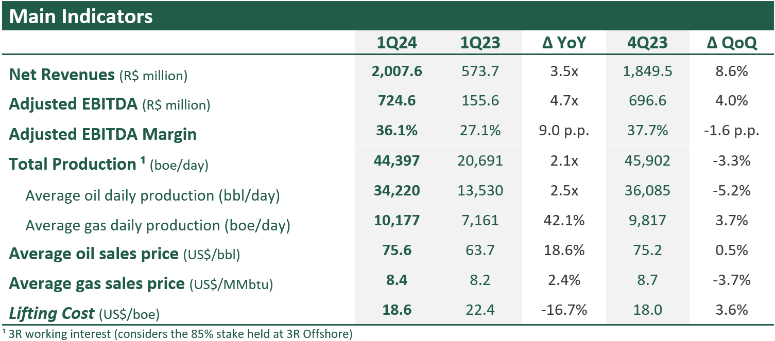 3R Petroleum Óleo e Gas S.A. (“3R” or “Company”) (B3: RRRP3) hereby presents its results for the first quarter of 2024 (“1Q24”) . Except as indicated otherwise, the financial and operational information herein described is presented on a consolidated basis, in Brazilian Reais (R$), and in accordance with International Financial Reporting Standards (IFRS).