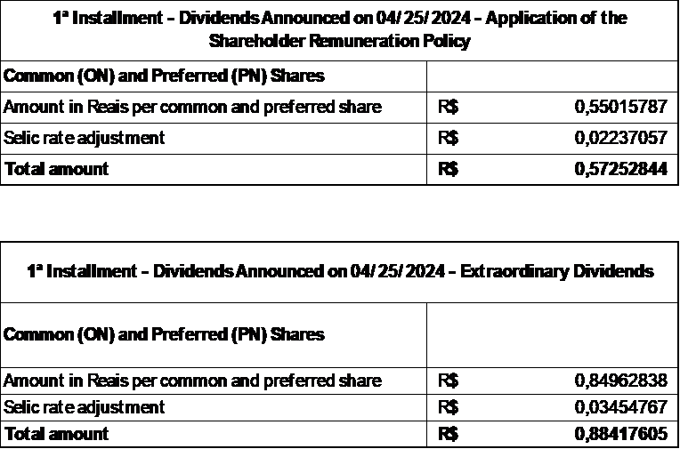 Dividends calculated in accordance with the Shareholder Remuneration Policy formula will be paid based on the shareholder position of 04/25/2024 and extraordinary dividends will be paid based on the shareholder position of 05/02/2024.