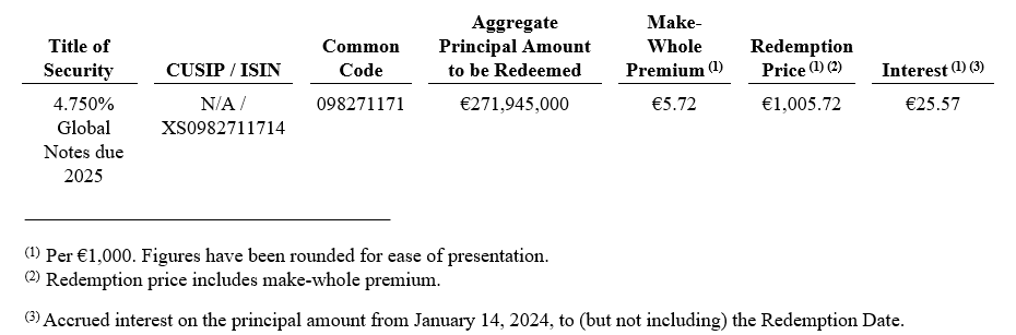 The Principal Paying Agent, as common depositary for Clearstream and Euroclear, will cause funds to be paid to its participants in the aggregate amount of €273,500,525.40 (or approximately €1,005.72 per €1,000 principal amount of the Notes), which constitutes the redemption price for the Notes. The redemption price includes a make-whole premium of €1,555,525.40 (or approximately €5.72 per €1,000 principal amount of the Notes). In addition to the redemption price, holders will receive accrued and unpaid interest on the principal amount of the Notes from January 14, 2024 to (but not including) the Redemption Date in the amount of €6,952,801.47 (or approximately €25.57 per €1,000 principal amount of the Notes).