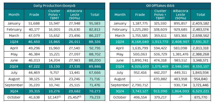 (2) Albacora Leste had its production impacted due to the replacement of a turbine, which is underway and expected to be completed by the first week of November. (3) As provided for in the JOA (Joint Operating Agreement), in October, Repsol Sinopec Brasil S.A. sold 929.689 barrels relating to its share of production from December/23 to October/24.
