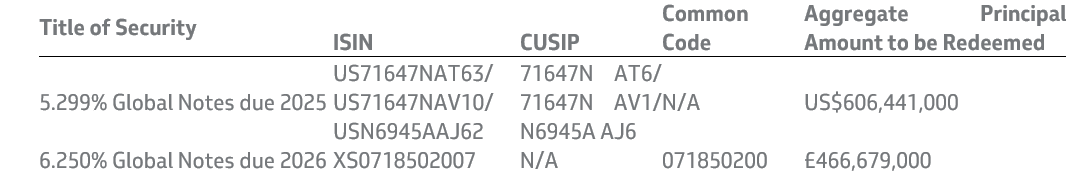 Payment on the 2025 Notes will be made prior to 3:00 pm New York City time and payment on the 2026 Notes will be made prior to 12:00 pm London time, in each case on the business day preceding the 2025 Notes Redemption Date or 2026 Notes Redemption Date, as applicable, by credit to the account of The Bank of New York Mellon, the trustee for the Notes (the “Trustee”), as paying agent for the Notes. For the 2025 Notes, the Trustee will cause funds to be paid to The Depositary Trust Company for further payment to its participants. For the 2026 Notes, the Trustee will cause funds to be paid to The Bank of New York Mellon, London Branch, as common depositary for Clearstream and Euroclear, for further payment to its participants.
