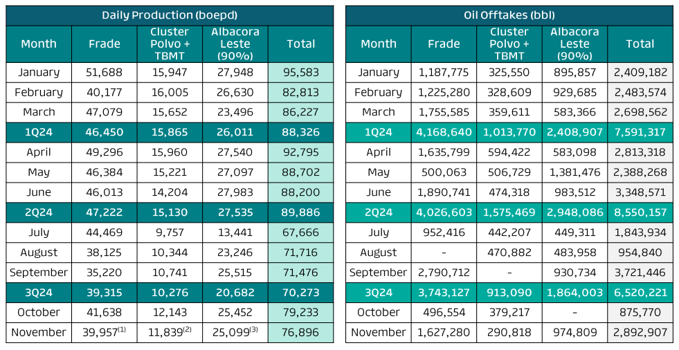 (1) The production of the Frade field was affected by a failure during the update of the turret’s communication system.