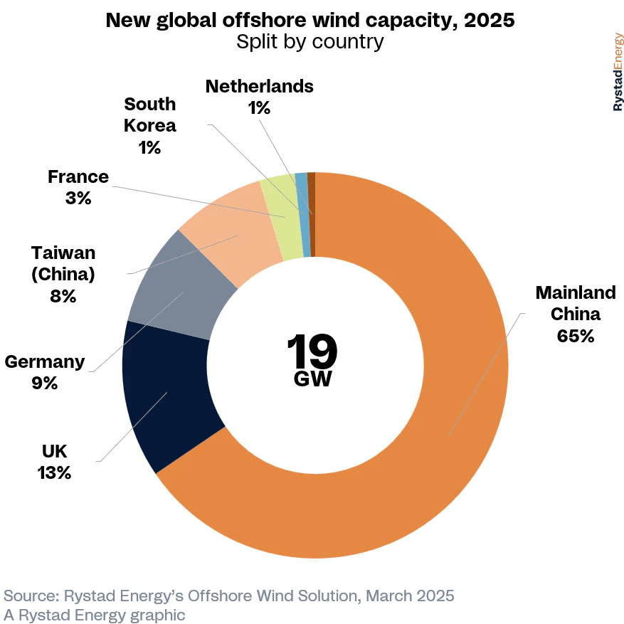 A record wave of lease auctions is driving the resurgence, said Rystad Energy, with the world’s largest offshore wind market, mainland China, accounting for 65 per cent of new capacity. With this increase, total additions will exceed the previous peak in 2021 by about 1 GW, surpassing 7.7 GW added in 2024, 10.2 GW in 2023, and 9.3 GW in 2022.