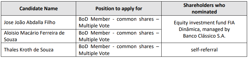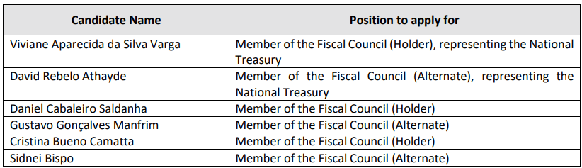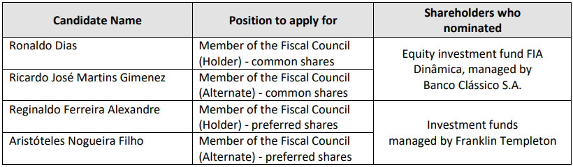 For the Fiscal Council, minority shareholders nominated the following candidates: