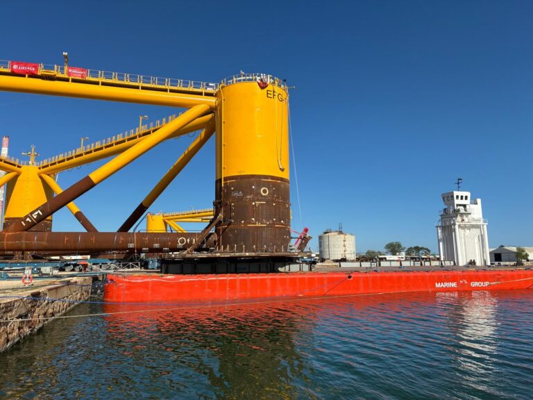 Eiffage Métal, Smulders, and their subcontractor Geodis, in coordination with Ocean Winds, launched the wind farm’s first floating platform on the Fos-sur-Mer industrial site.