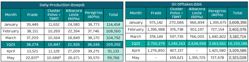 (1) Following the scheduled shutdown, the resumption of Frade’s operations was impacted by a failure in the gas compression system, which is expected to be resolved in the coming days. (2) In the Polvo and Tubarão Martelo cluster, production was affected by the shutdown of the wells TBMT-10H and TBMT-4H due to the failure of the Submerged Centrifugal Pump. On April 24, IBAMA granted approval for the workovers, and The Hunter Queen rig has already begun the workover of well TBMT-10H.