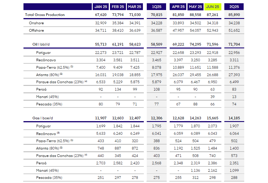 During 2Q25, a total of 3.93 million barrels of oil were sold in the offshore segment: (i) 1.07 million from Papa-Terra, (ii) 2.36 million from Atlanta, and (iii) 492 thousand from Parque das Conchas.