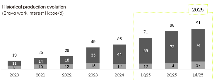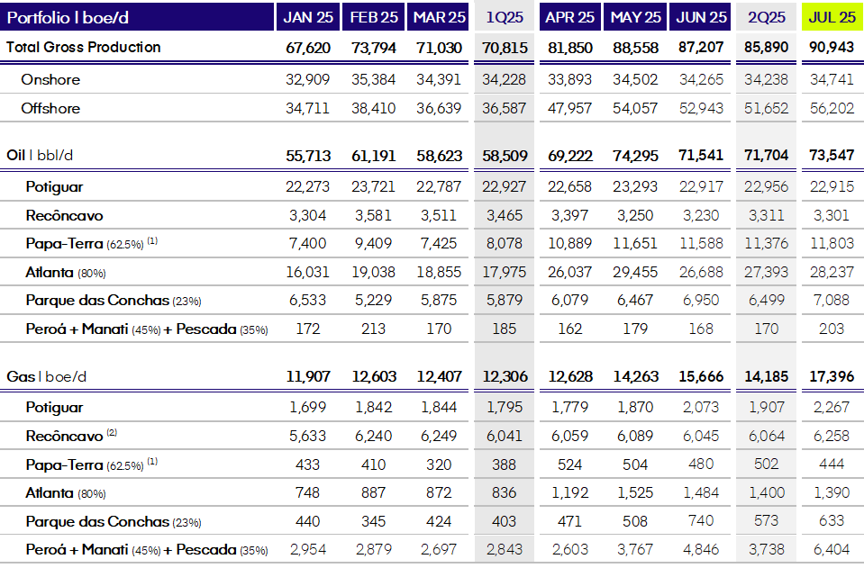 The Company renewed its historical production record in July, reaching a daily average of 90.9 thousand boe, an increase of 6.0% compared to the average recorded in the second quarter of 2025. This result mainly reflects the evolution of the offshore segment, with emphasis on Papa-Terra, which recorded in July 2025 the best production result since August 2021, and the strong evolution of the Atlanta operation during the first half of 2025.
