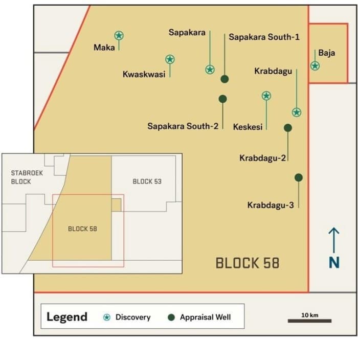 As Guyana’s oil boom gained momentum, with production commencing in December 2019, partners TotalEnergies and APA Corporation announced in January 2020 that they had made a significant oil discovery in Suriname’s territorial waters. This occurred with the Maka Central-1 wildcat well in Block 58 offshore Suriname. The well, which was drilled to 20,670 feet (6,300 meters), found 240 feet (73 meters) of oil pay and 164 feet (50 meters) of light oil and gas condensate pay. This was followed by four additional major discoveries in Block 58, where TotalEnergies is the operator holding a 50% working interest with the remainder held by APA Corporation.