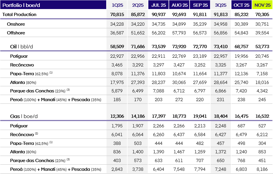 Dec. 4 – BRAVA ENERGIA S.A. (“BRAVA” or “Company”) (B3: BRAV3), informs its investors and the market in general the preliminary and unaudited production data for the month of November 2025.