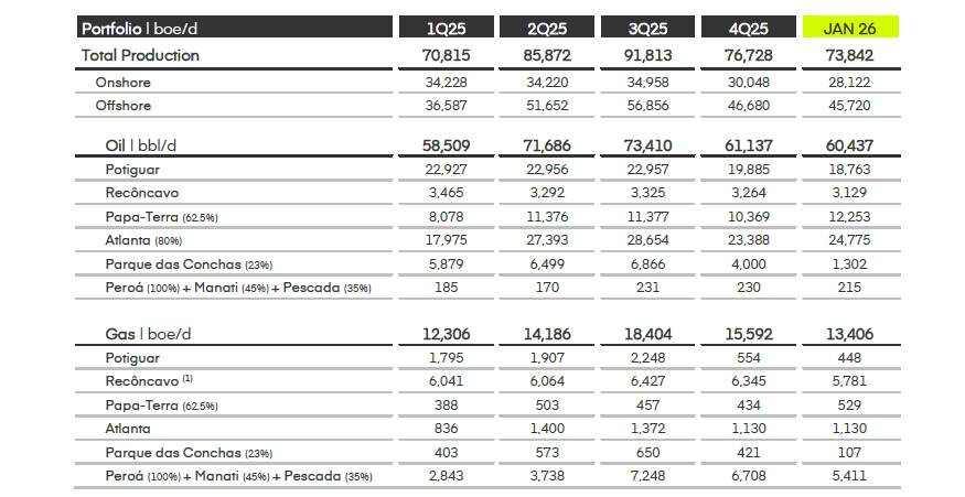 Potiguar – The monthly results reflect the impact of the temporary shutdown of facilities in the region, resulting from the audit conducted by the ANP in September 2025. The Company has been gradually receiving the required approvals to resume production. In addition, power supply failures impacted production in the month of January