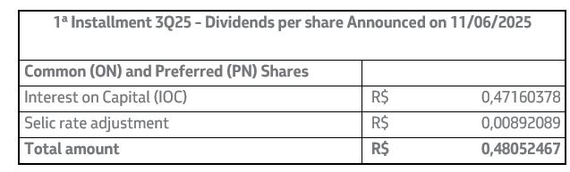 This first installment will be paid in the form of interest on capital, with the gross amounts per share adjusted by the Selic rate from 12/31/2025 to 02/20/2026, according to the interest rate adjustment calculation, as listed below: