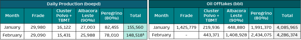 Key: (1) Monthly production was impacted by isolated events, all of which have been resolved: (i) in Frade, operations were limited by the well testing campaign required by ANP and multiphase meter tests for the Wahoo Project; (ii) in the Polvo and TBMT cluster, there was a temporary turbine failure; (iii) in Albacora Leste, production was affected by preventive compressor maintenance; and (iv) in Peregrino, a power generation failure on the FPSO limited operations for 3 days.