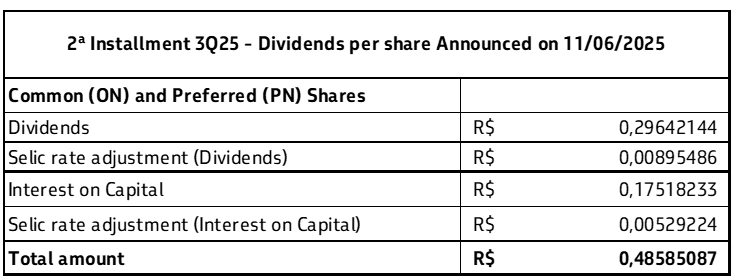 This second installment will be paid both as dividends and as interest on capital, whose gross amounts per share will be adjusted by the Selic rate from 12/31/2025 to 03/20/2026, according to the interest rate adjustment calculation, as demonstrated below: