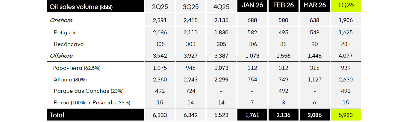 Brava operates the Potiguar, Recôncavo, Papa-Terra, Atlanta, and Peroá assets, and also holds a non-operated 35% stake in Pescada, 45% in the Manati Field, both operated by Petrobras, and 23% in Parque das Conchas, operated by Shell. Detailed production information per asset is updated monthly in the Company’s valuation guide, available on the Investor Relations website, click here to access it.