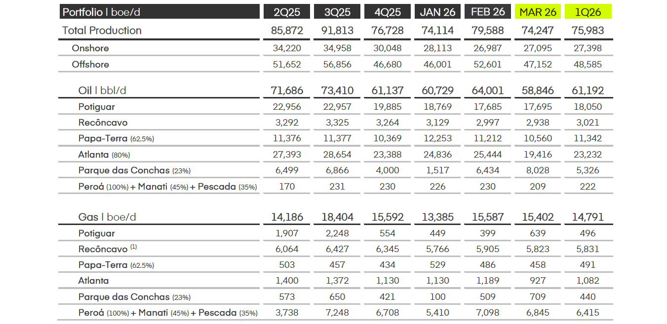 April 9 – BRAVA ENERGIA S.A. (“Brava” or “Company”) (B3: BRAV3), informs its investors and the market in general of the preliminary and unaudited production data for the month of March 2026.