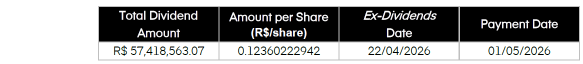 The Dividends will be due to those registered as shareholders of the Company on the record date of April 20, 2026, including transactions carried out up to and including that date. The Company’s shares will be traded ex-dividends as of April 22, 2026, inclusively.