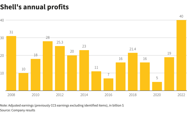 (Reuters) - Shell (SHEL.L) delivered a record $40 billion profit in 2022, the energy giant said on Thursday, capping a tumultuous year in which a surge in energy prices after Russia's invasion of Ukraine allowed it to hand shareholders unprecedented returns. The British company's record earnings, which more than doubled from a year earlier, mirror those reported... Continue Reading →