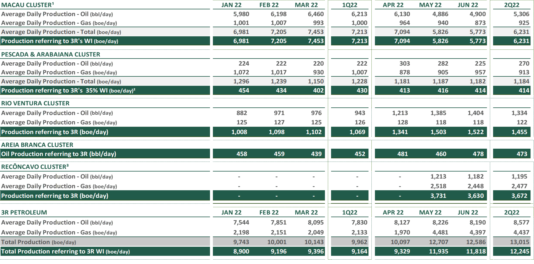 3R PETROLEUM ÓLEO E GÁS S.A. (“3R” or “Company”), following best practices in corporate governance and transparency, informs its investors and the market in general the preliminary unaudited production data for June 2022 in the assets that the Company holds participation. (1) The Macau Cluster had its production in May impacted by a technical problem linked... Continue Reading →