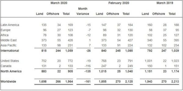 Worldwide offshore rig count in March drops by four rigs sequentially and year-over-year