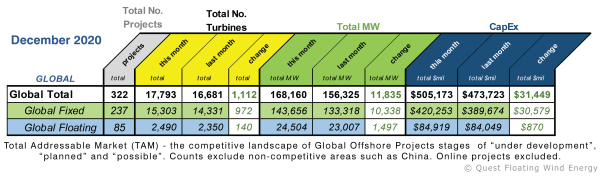 The Quest Offshore Wind Turbine Index (QOWTI), which tracks the Total Addressable Market for offshore wind*, shows 322 global projects for December a gain of 28 projects since September, comprising 17,793 individual turbine units representing a CapEx of $505.2 billion. Although Asia Pacific continues to lead Europe in total project count, Europe leads all regions... Continue Reading →