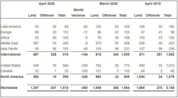 The worldwide offshore rig count in April 2020 dropped 28 rigs year-over-year and 19 rigs sequentially, according to rig count reports by Baker Hughes. Baker Hughes splits its rig counts into international and North America rig counts, which combined make the worldwide rig count. Continue reading
